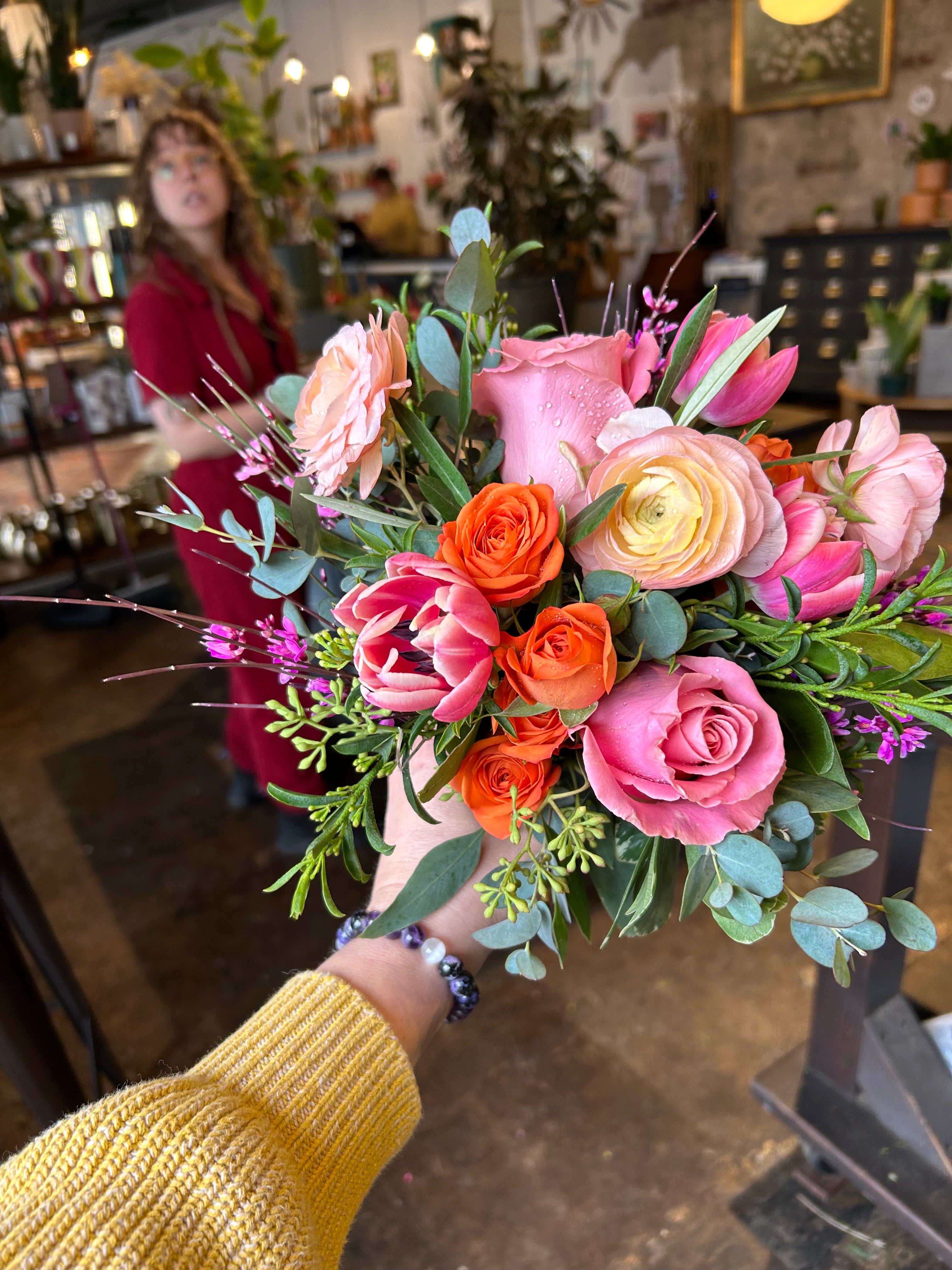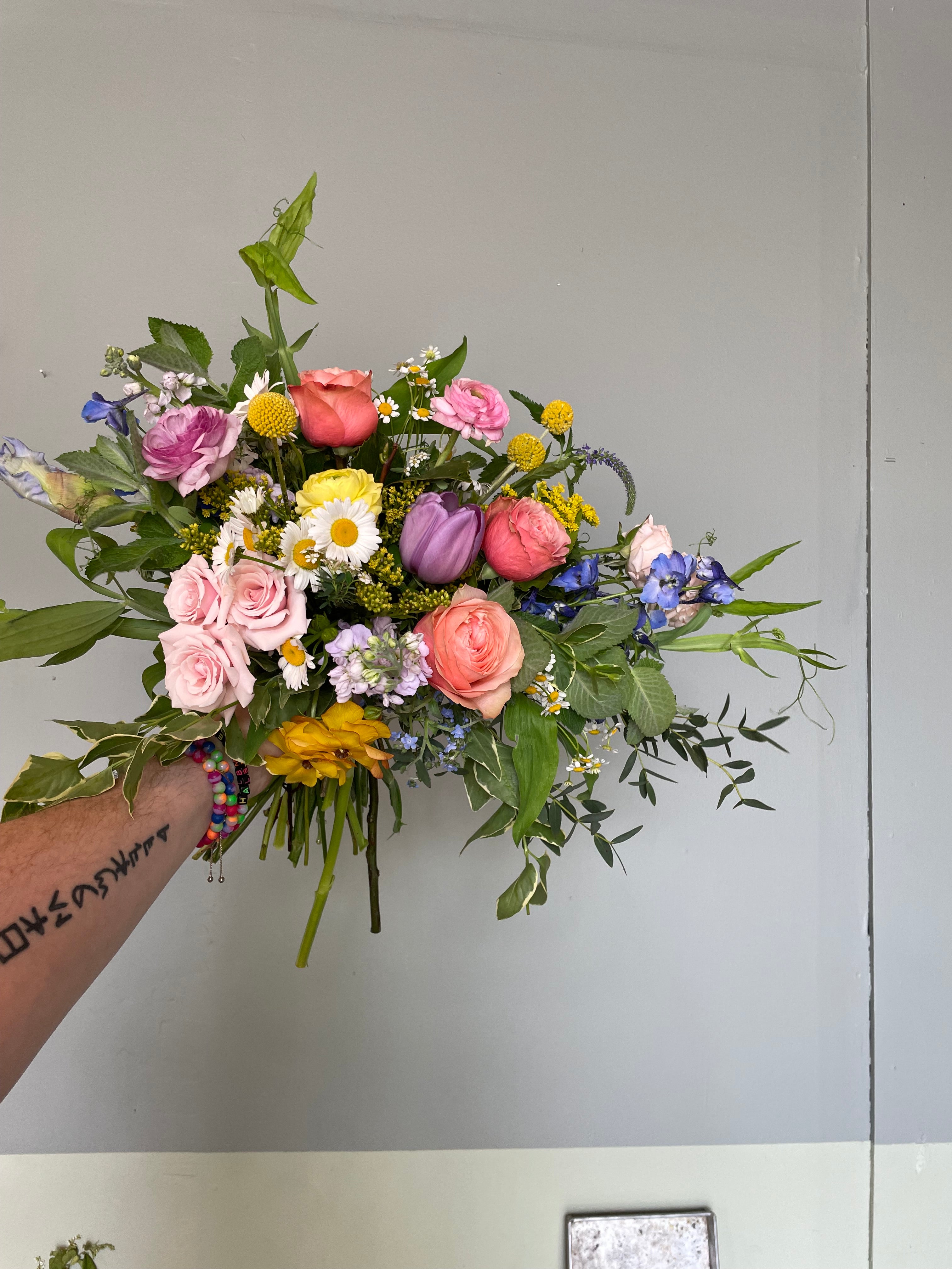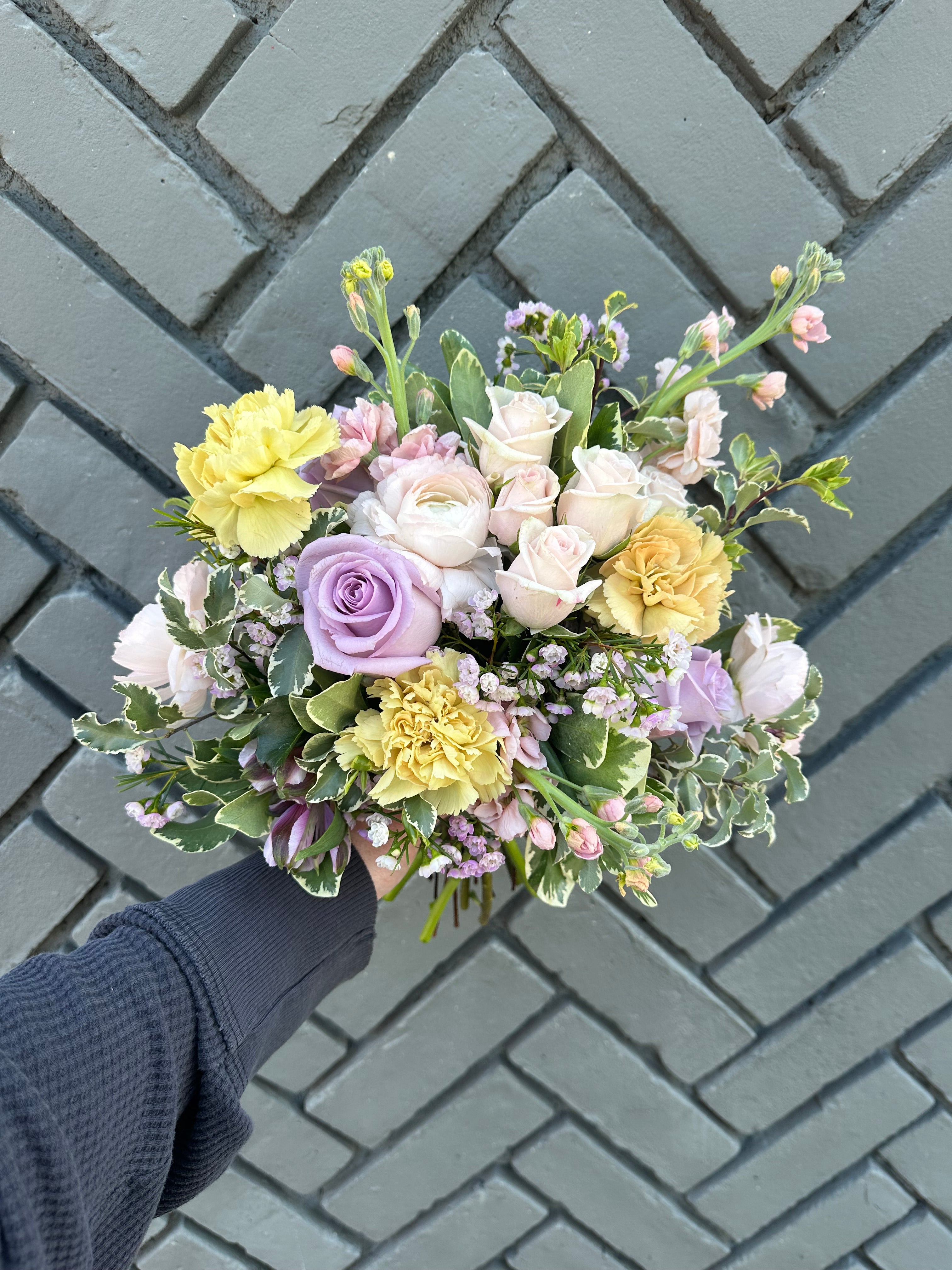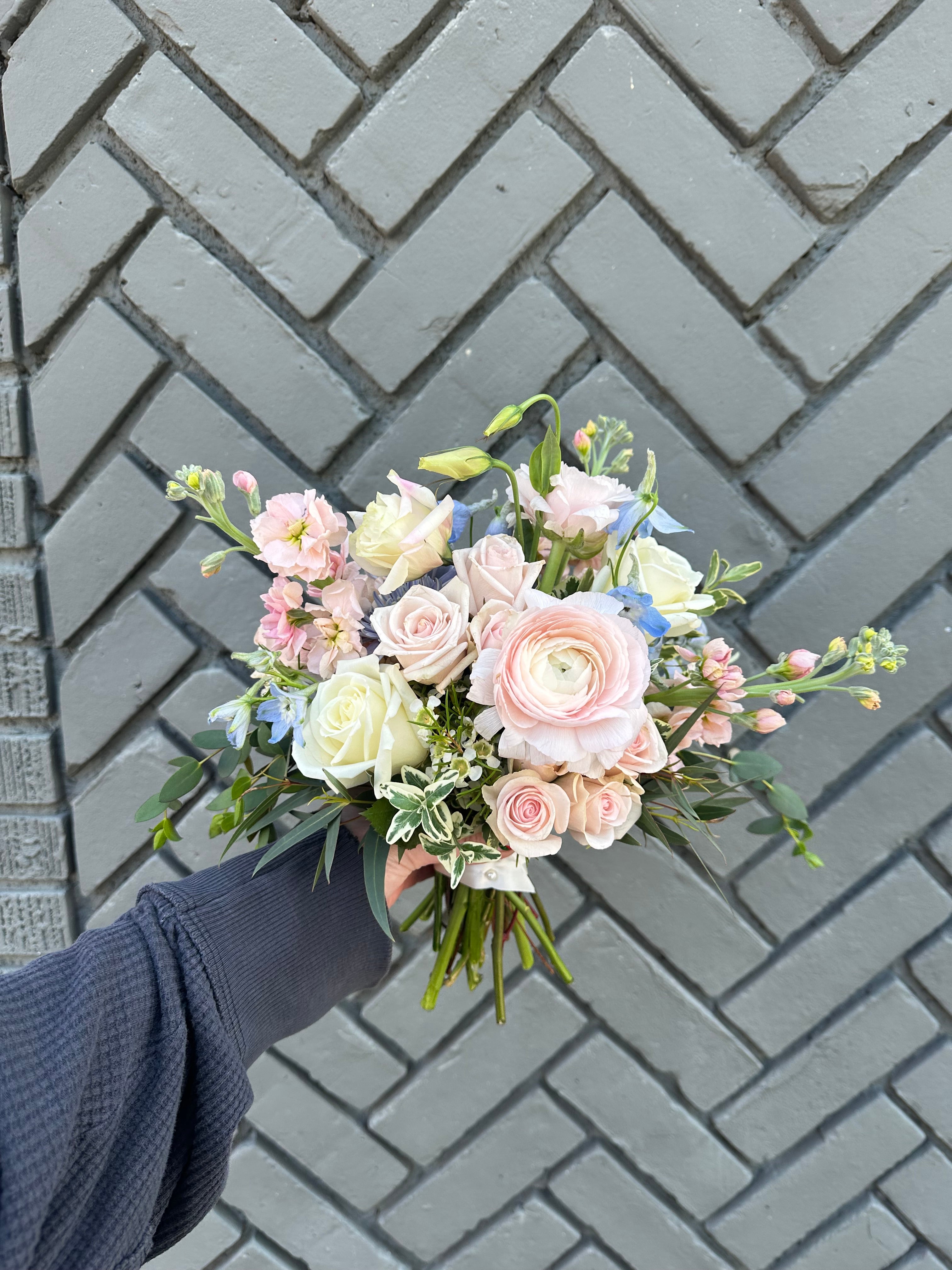 this bouquet will feature local blooms and other seasonal florals chosen by our team of expert designers. choose your color palette and let us work our magic to create something beautiful. we would normally suggest a larger bouquet for the bride and smaller versions for bridesmaids.