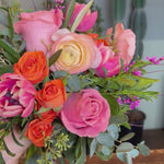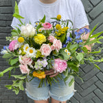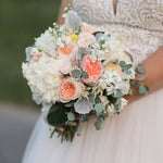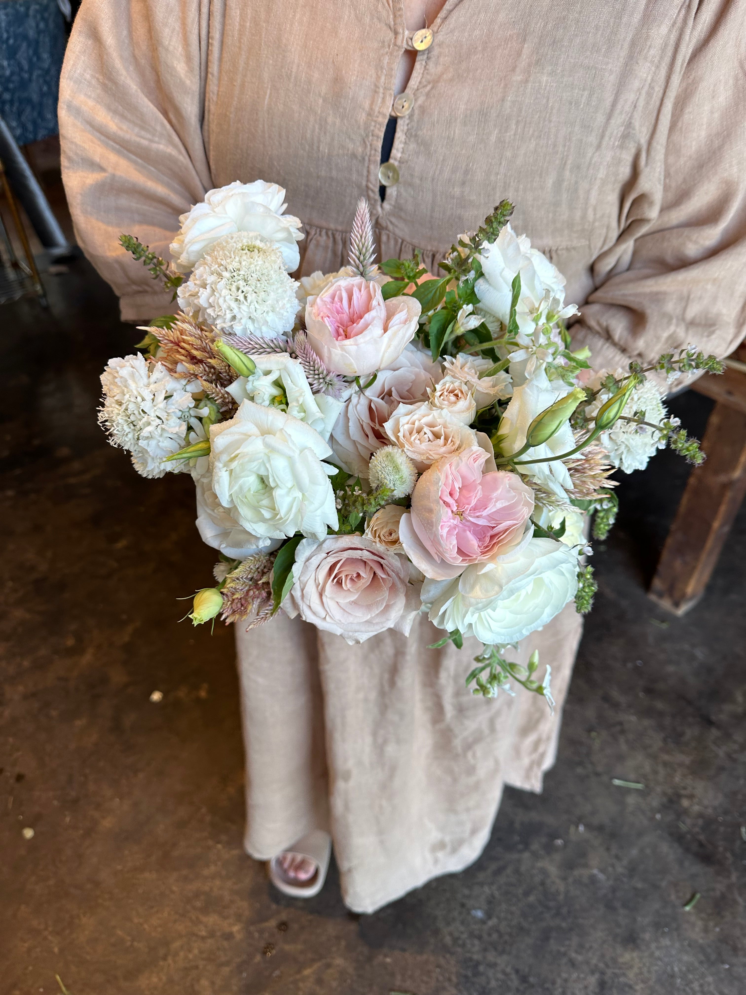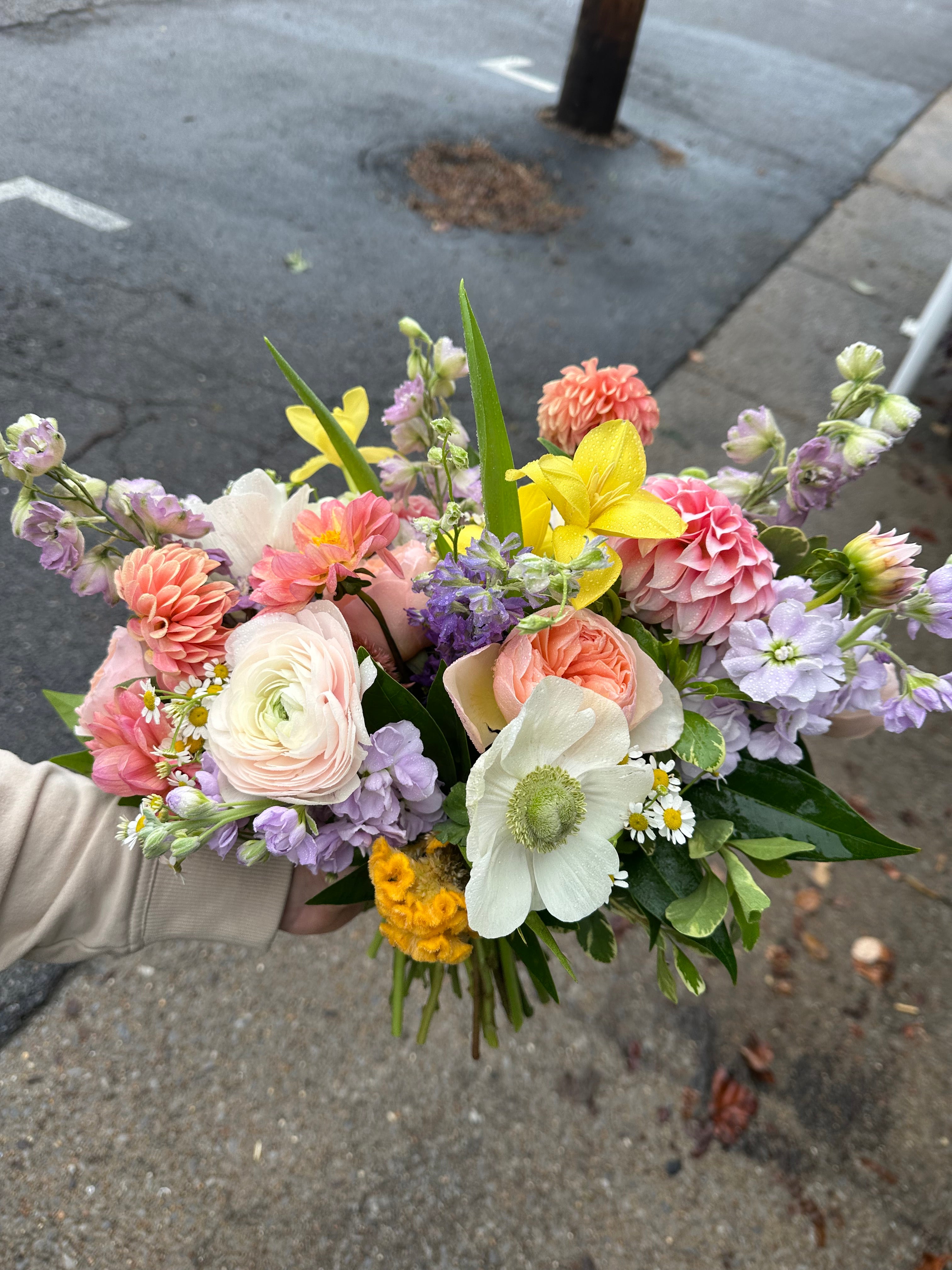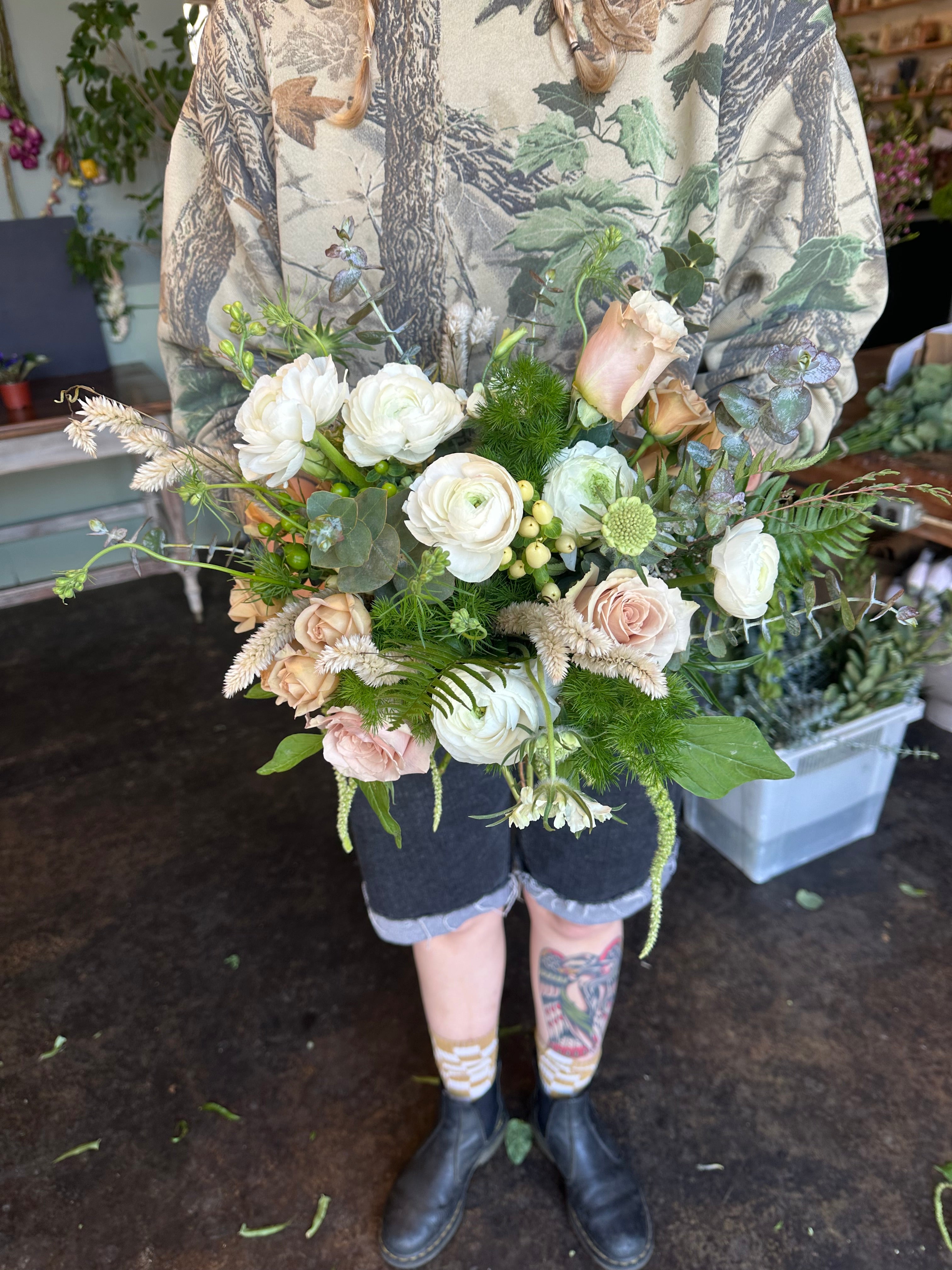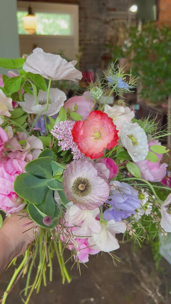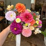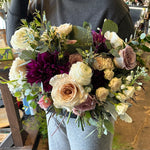 this bouquet will feature local blooms and other seasonal florals chosen by our team of expert designers. choose your color palette and let us work our magic to create something beautiful. we would normally suggest a larger bouquet for the bride and smaller versions for bridesmaids.