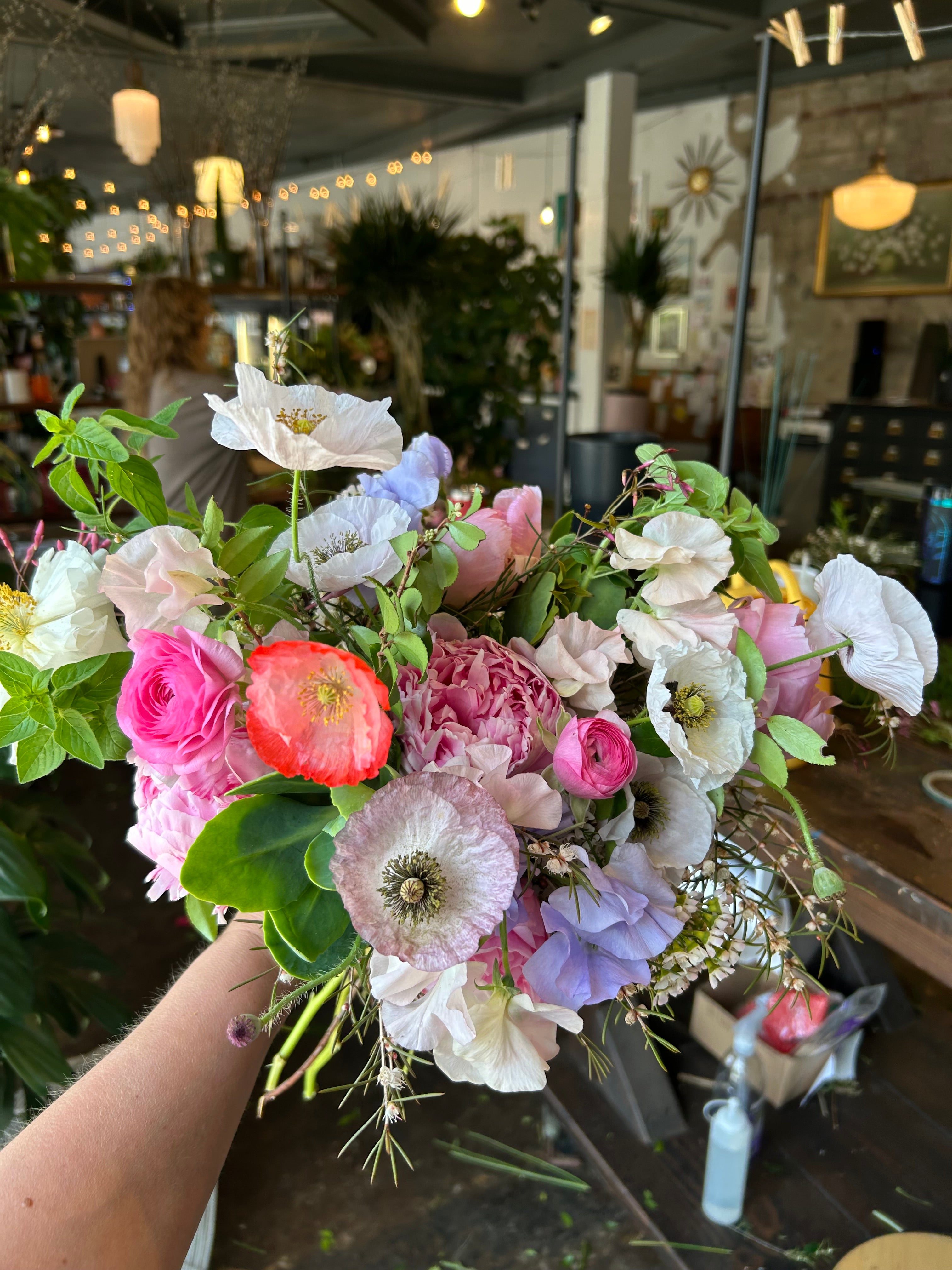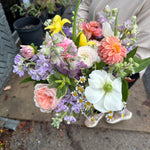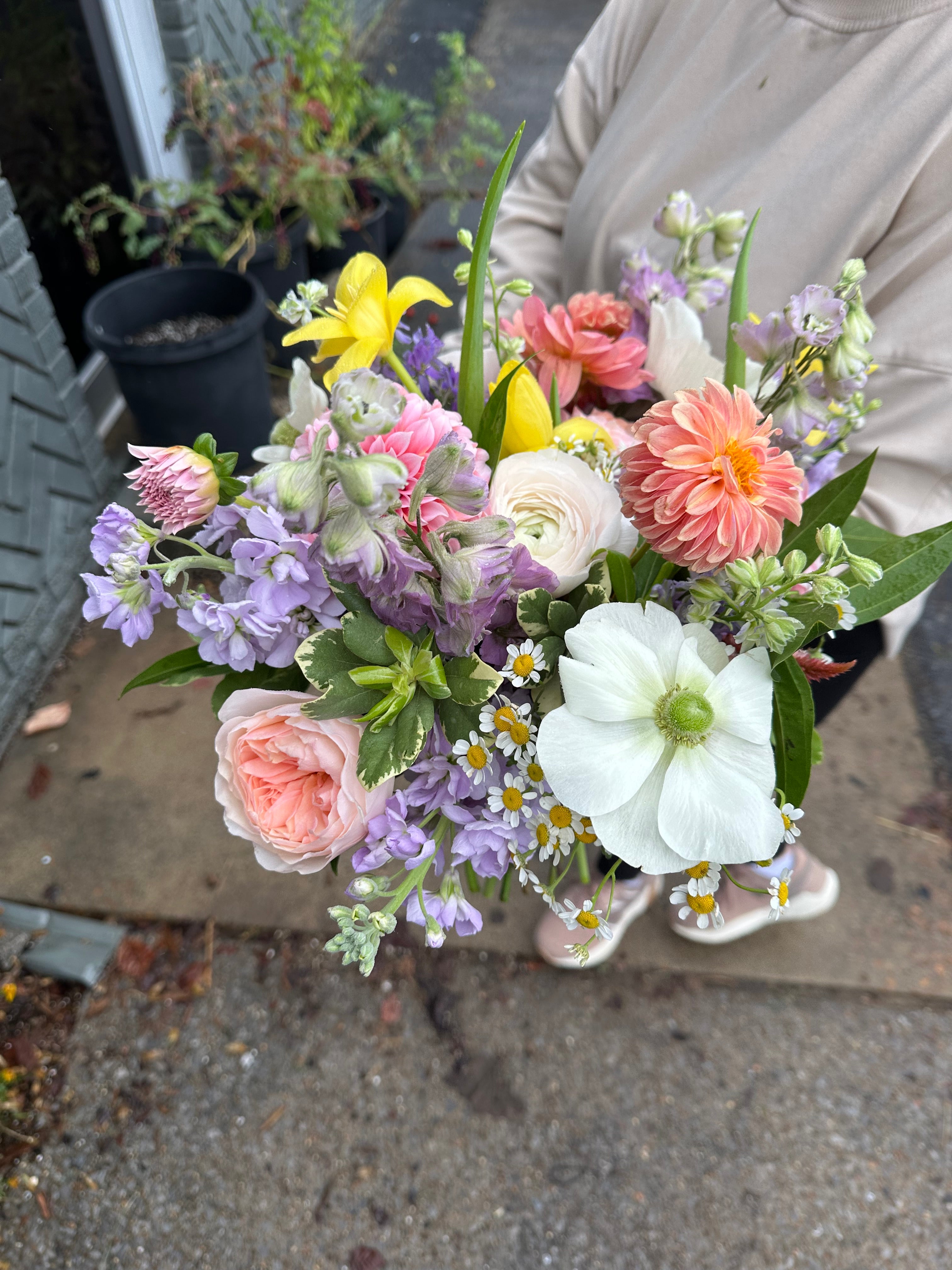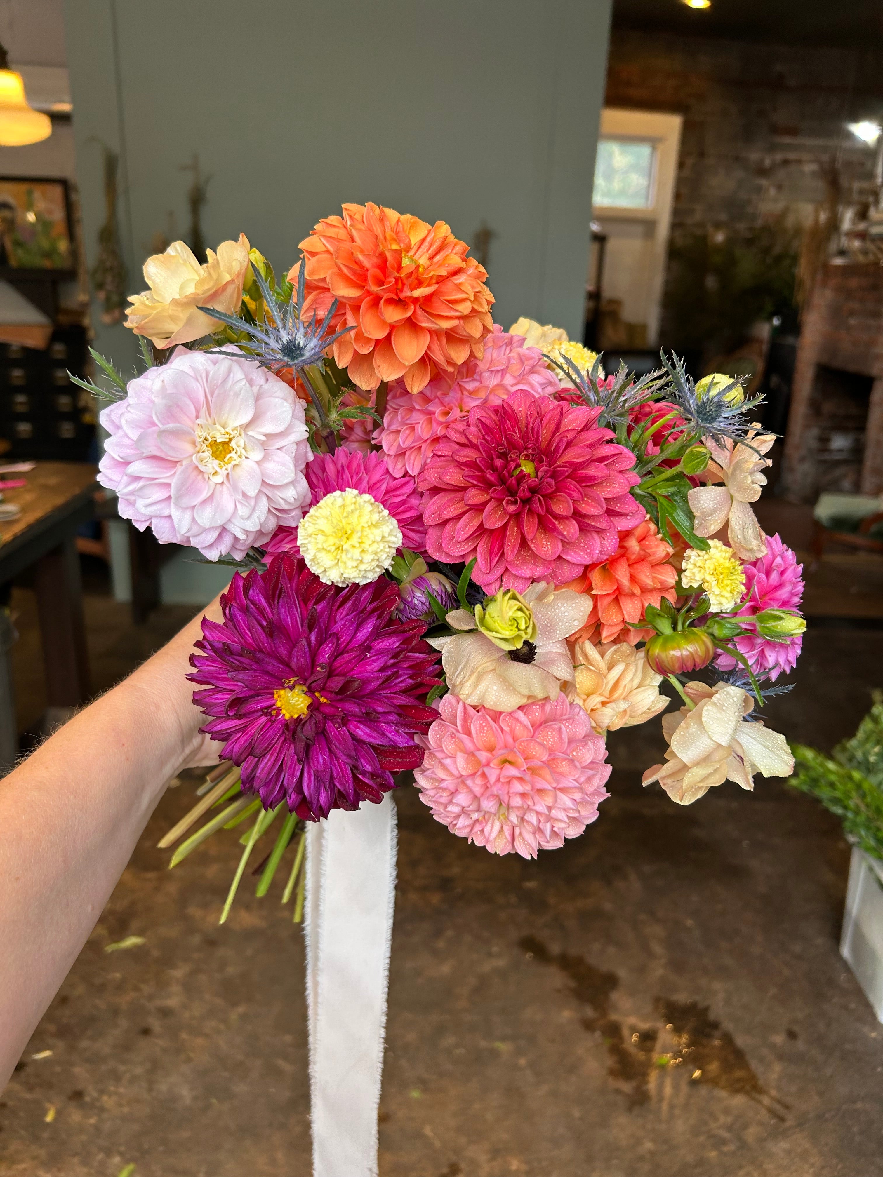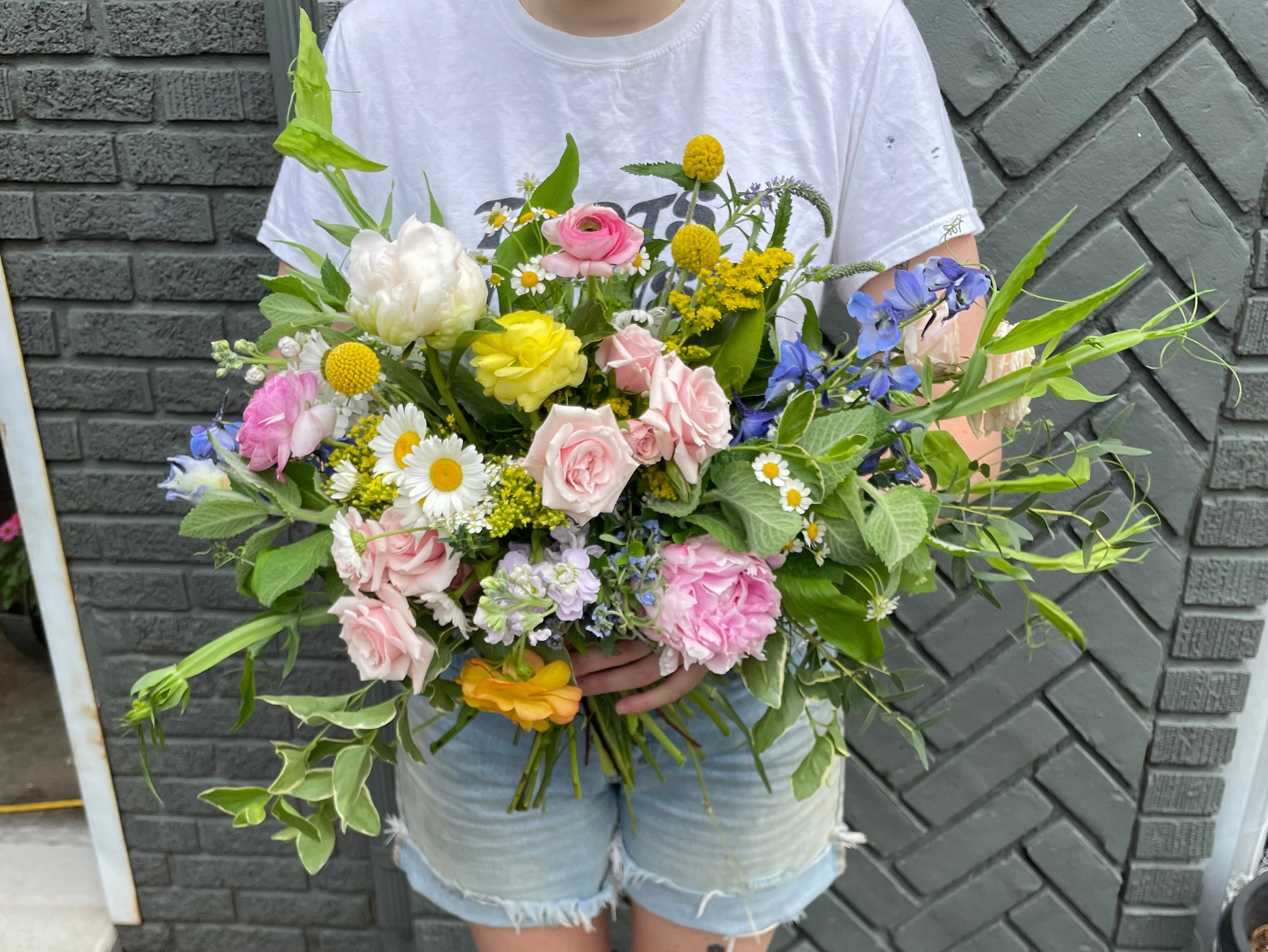 this bouquet will feature local blooms and other seasonal florals chosen by our team of expert designers. choose your color palette and let us work our magic to create something beautiful. we would normally suggest a larger bouquet for the bride and smaller versions for bridesmaids.