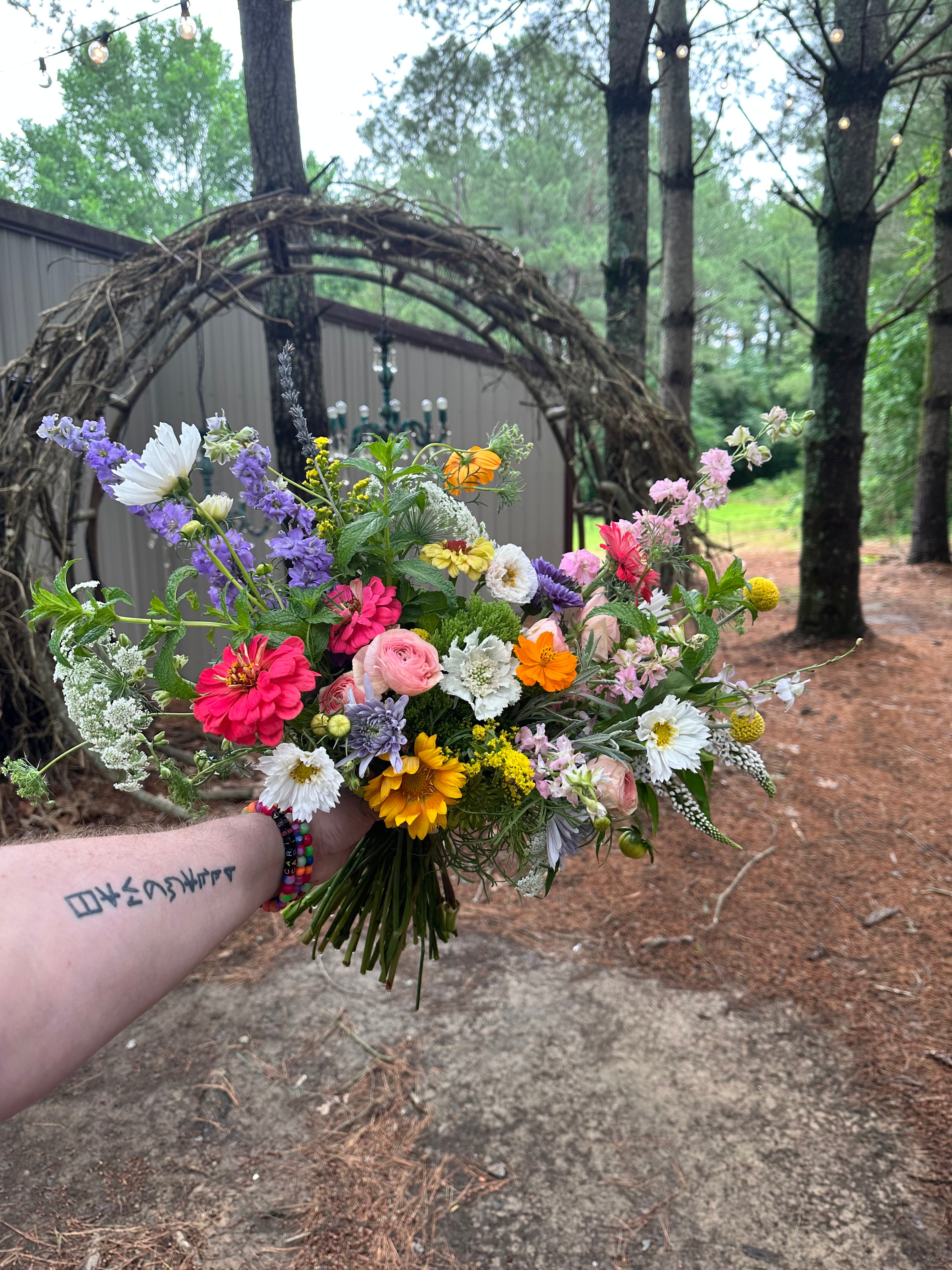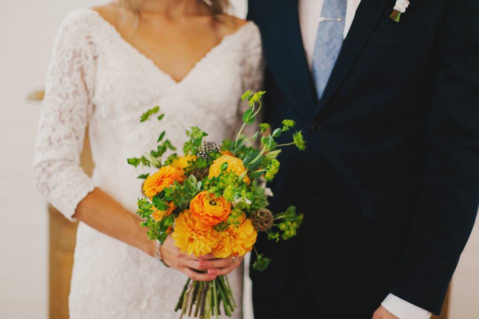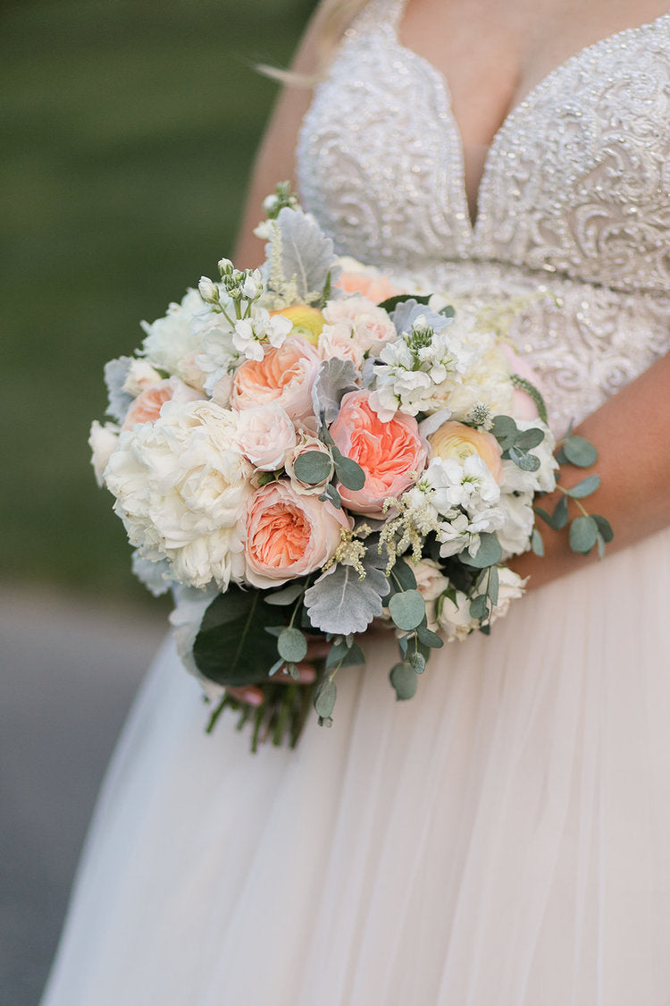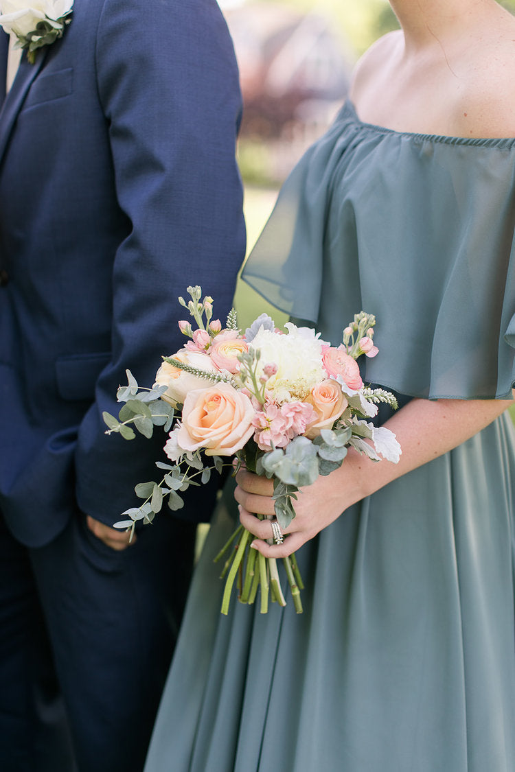 color palette- provide a description of your wedding colors in the notes section and we'll work with our local farmers/ wholesaler to create a color story to match for your special day. please note- we only work with fresh flowers so colors like gold and silver will only be included in details like the ribbon wrap.